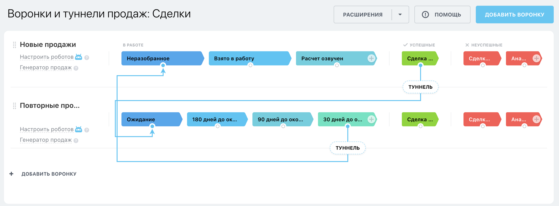 Удобно настроенные воронки продаж для того что бы ни одно обращение от клиента не пропало, а так же система оповестит о пролангации по клиенту